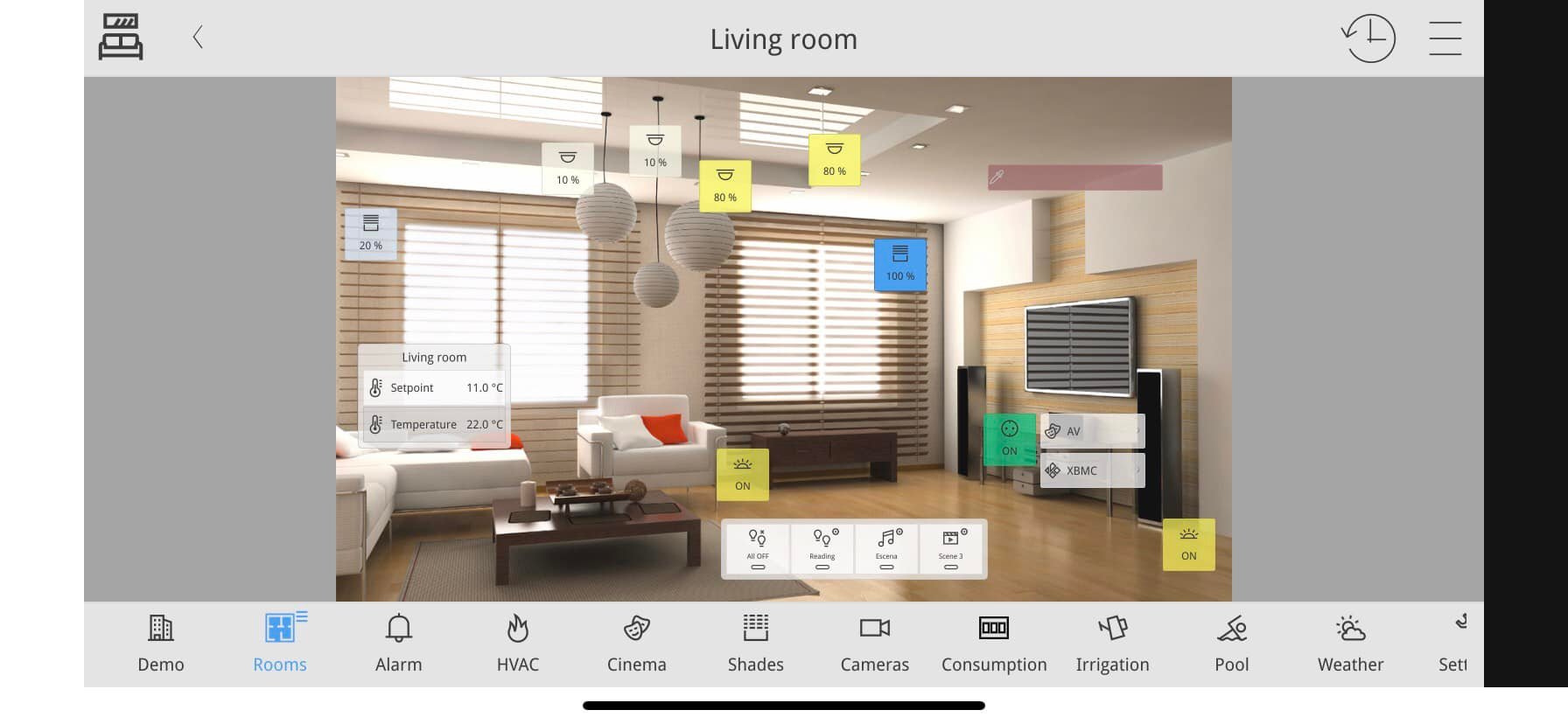 Hệ thống kết nối tất cả các thiết bị điện trong căn biệt thự thành một hệ thống mạng, điều khiển chúng theo các kịch bản thông minh, bao gồm: hệ thống đèn chiếu sáng, rèm cửa, điều hòa nhiệt độ, tivi, âm thanh, khóa cửa, bình nóng lạnh, quạt thông gió, hệ thống bơm tưới nước tiểu cảnh,...