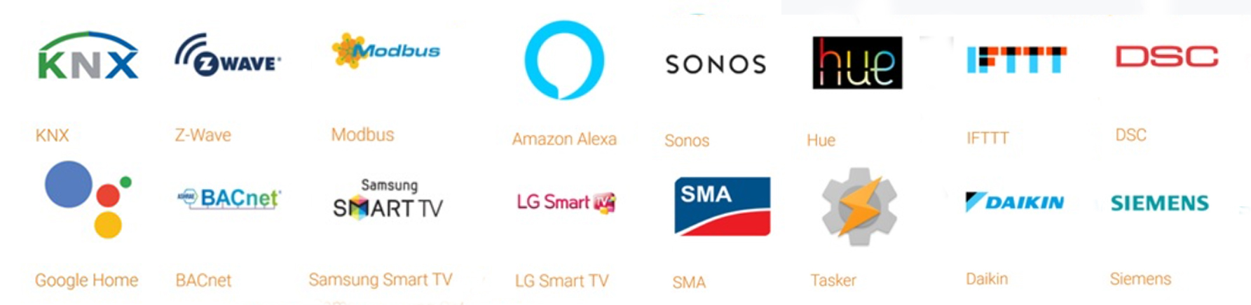 Hỗ trợ hầu hết các chuẩn truyền thông kết nối, các công nghệ, sản phẩm tiện nghi cho nhà thông minh: Modbus, BacNet, KNX, Z-Wave, thiết bị TCP/IP, Google Assistant, Amazon Alexa, Sonos, Samsung Smart TV, LG Smart TV, Philips Hue, IP cameras, DSC, Paradox, Satel, Kodi, Global Caché, IRTrans, DoorBird, IFTTT, Fronius, foobot,..