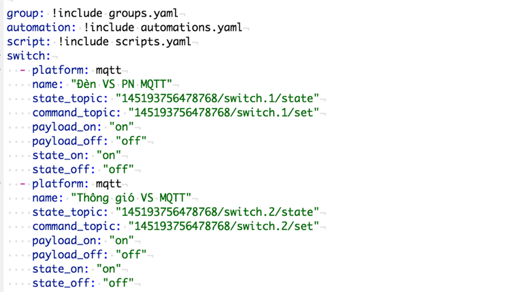 Phần name có thể đổi tùy ý. Đây sẽ là các tên của công tắc sẽ hiển thị trong Home Assistant