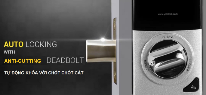 - Chức năng khóa cửa tự động Auto Locking: tự động khóa cửa sau khi khóa đã được mở nhưng cửa vẫn đang ở vị trí đóng, với chốt khóa bằng inox 304 chống cắt rất an toàn.