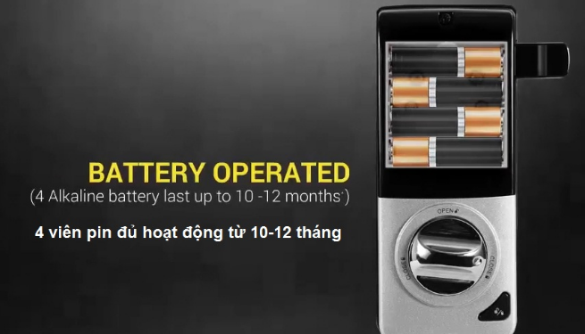 - Khả năng tiết kiệm năng lượng cao khi sử dụng nguồn điện 6V (4 pin alkaline 1,5V cỡ AA) cung cấp khả năng hoạt động lên tới 10-12 tháng (nếu 1 ngày sử dụng khóa trung bình 10 lần).