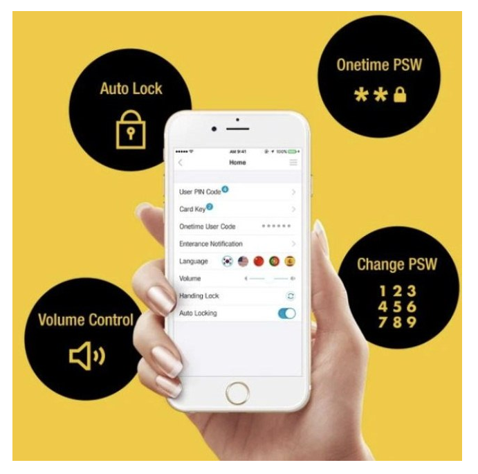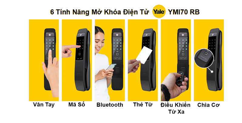 - Các cách mở khóa: vân tay (đăng kí được tới 100), thẻ từ (đăng kí được 100, sẵn có 4 chiếc), mã số, chìa cơ (2 chiếc). Có thể lắp thêm phụ kiện để đóng mở khóa từ xa (dùng mobile) qua bluetooth, qua remote control, qua mạng wifi/ 4G (dùng với Yale bridge), qua chuông hình, hoặc hệ thống nhà thông minh (dùng với module Zigbee hoặc Zwave)