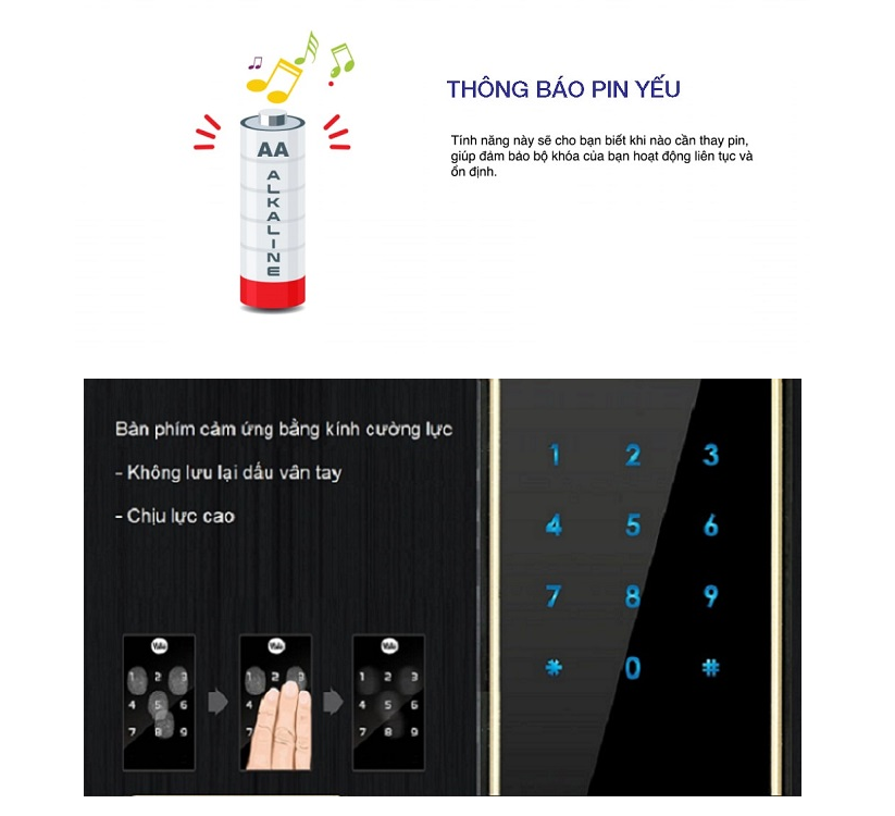 - Âm thanh báo động trong 30 phút khi có hiện tượng phá khoá (có lực tác động mạnh lên khóa); Và khi nhiệt độ trong nhà trên 55°C thì vừa báo cháy, vừa tự động mở khóa để thoát hiểm